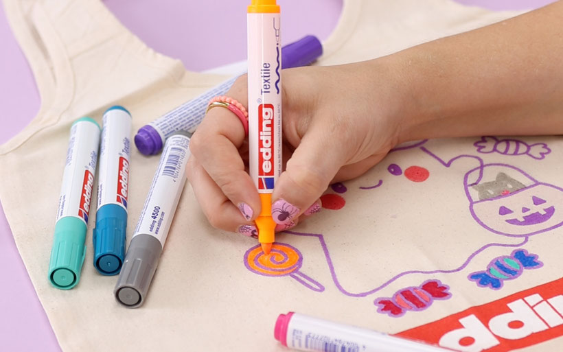 Ich durfte für dieses Projekt die edding 4500 Textilmarker ausprobieren – und ich sag’s euch: die machen richtig Spaß! Die Farben sind superdeckend, verlaufen nicht und lassen sich richtig präzise auftragen. Die Rundspitze (2–3 mm) ist perfekt, um sowohl feine Linien als auch größere Flächen zu gestalten – also ideal für Outlines und zum Ausmalen. Die Tinte basiert auf Wasser, ist geruchsneutral und nach dem Fixieren mit dem Bügeleisen sogar waschbeständig bis 60 °C. Das Set enthält viele kräftige Farben (sogar ein paar richtig coole Neon-Töne, mit denen man wunderbar kreativ werden kann – ob auf Baumwolle, Leinen oder anderen hellen Stoffen.