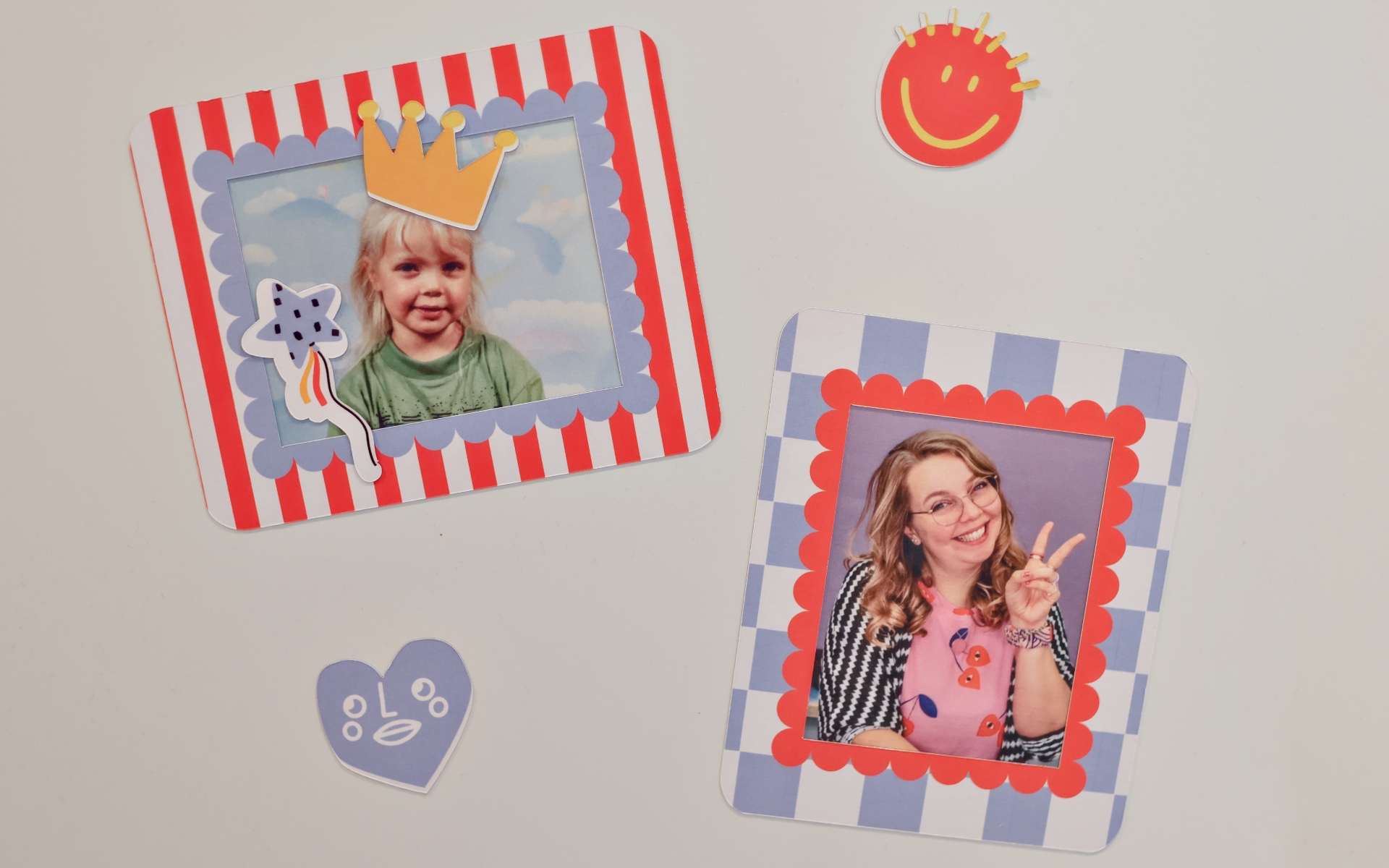 Noch ein kleiner Hack: Die Mitte des Rahmens nicht leer lassen. Ich habe dort kleine zusätzliche Motive platziert – Smileys, Herzen, Sterne. Das spart Material und ihr bekommt direkt mehrere kleine Magnete aus einem Bogen.