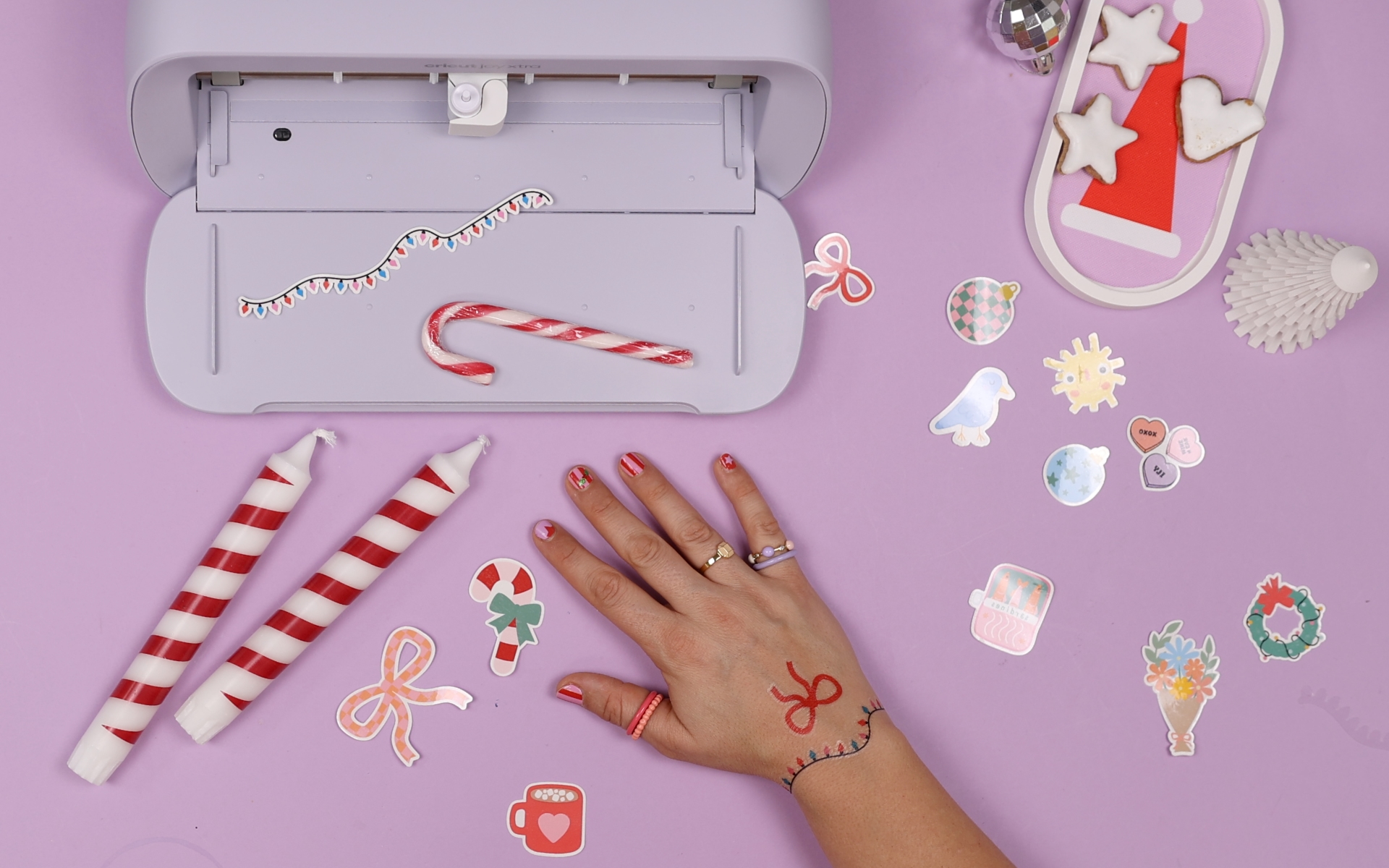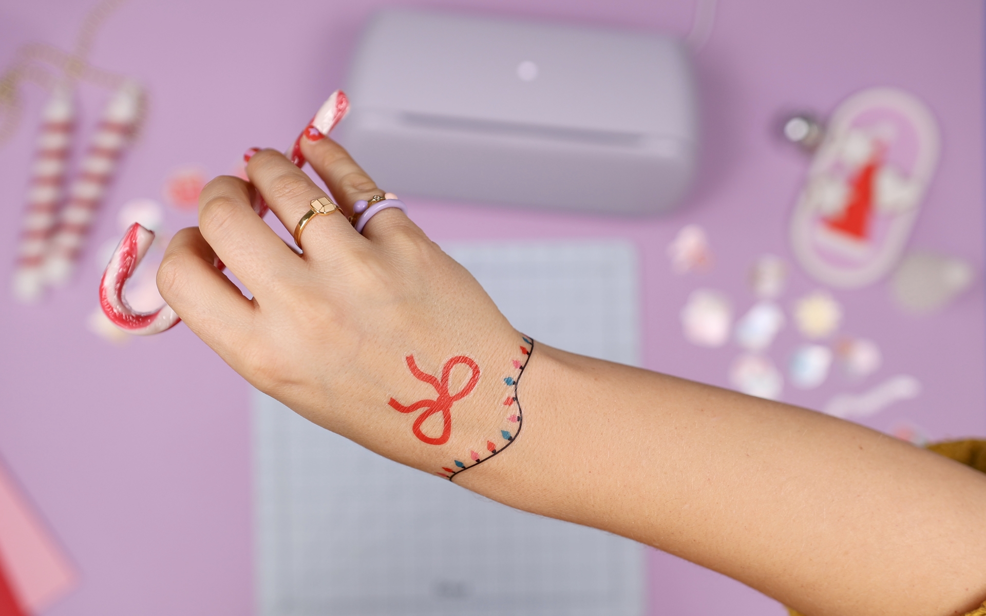 Cricut hat jetzt auch Printable Temporary Tattoo Sheets – und die sind ein Knaller. Sie sind nicht permanent, sondern wie diese Fun-Tattoos, die du mit Wasser aufträgst. Ich habe daraus ein Tattoo-Set mit vielen weihnachtlichen Motiven erstellt: Schleife, Girlande, kleine Symbole… Perfekt als Geschenk, als Party-Aktivität oder auch für Silvester.