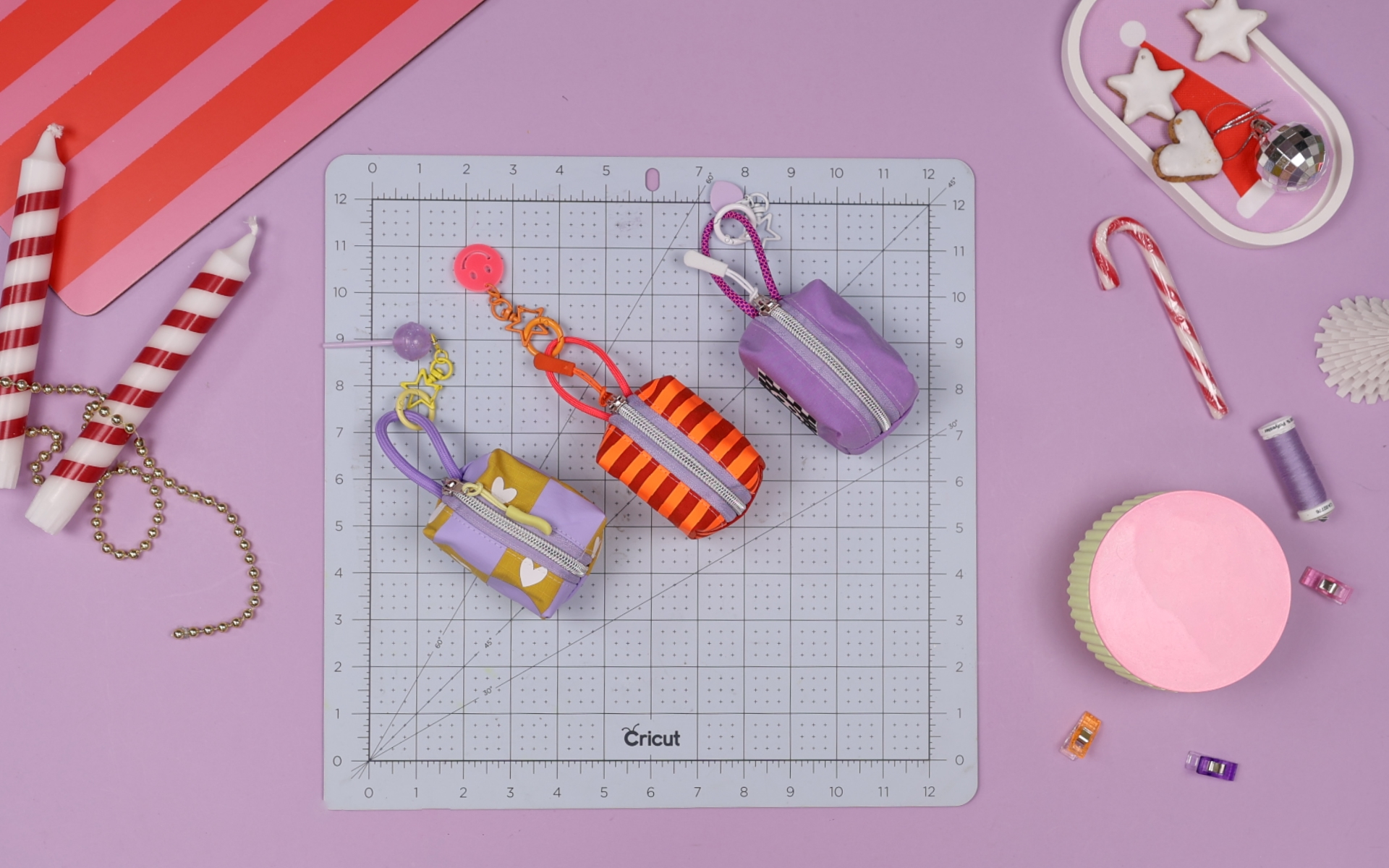 Das letzte Projekt ist mein Favorit: Mini BoxBags mit Schlüsselring. Die Größe ist ideal für Kopfhörer, Lippenpflege, kleine Süßigkeiten oder Gutscheine – und als Anhänger am Schlüsselbund oder der Tasche einfach genial. Ich nutze hier den Cricut Maker 4, weil er auch Stoff direkt schneiden kann. Ich schneide hier mit der Rollklinge und der Einstellung „Canvas / Leinwand“. Ich verwende Oilskin – der franst kaum aus und hat Stand. Alternativ gehen Kunstleder oder verstärkter Canvas.