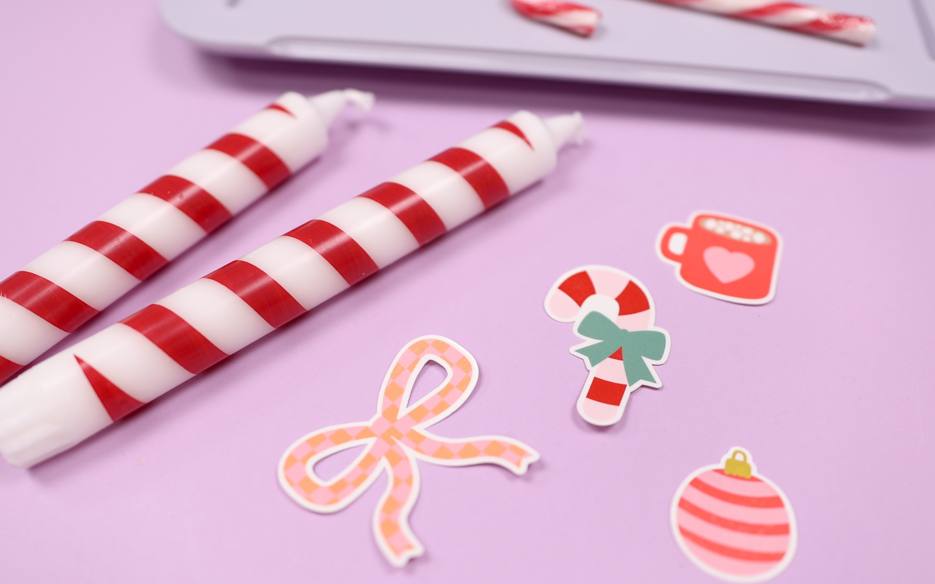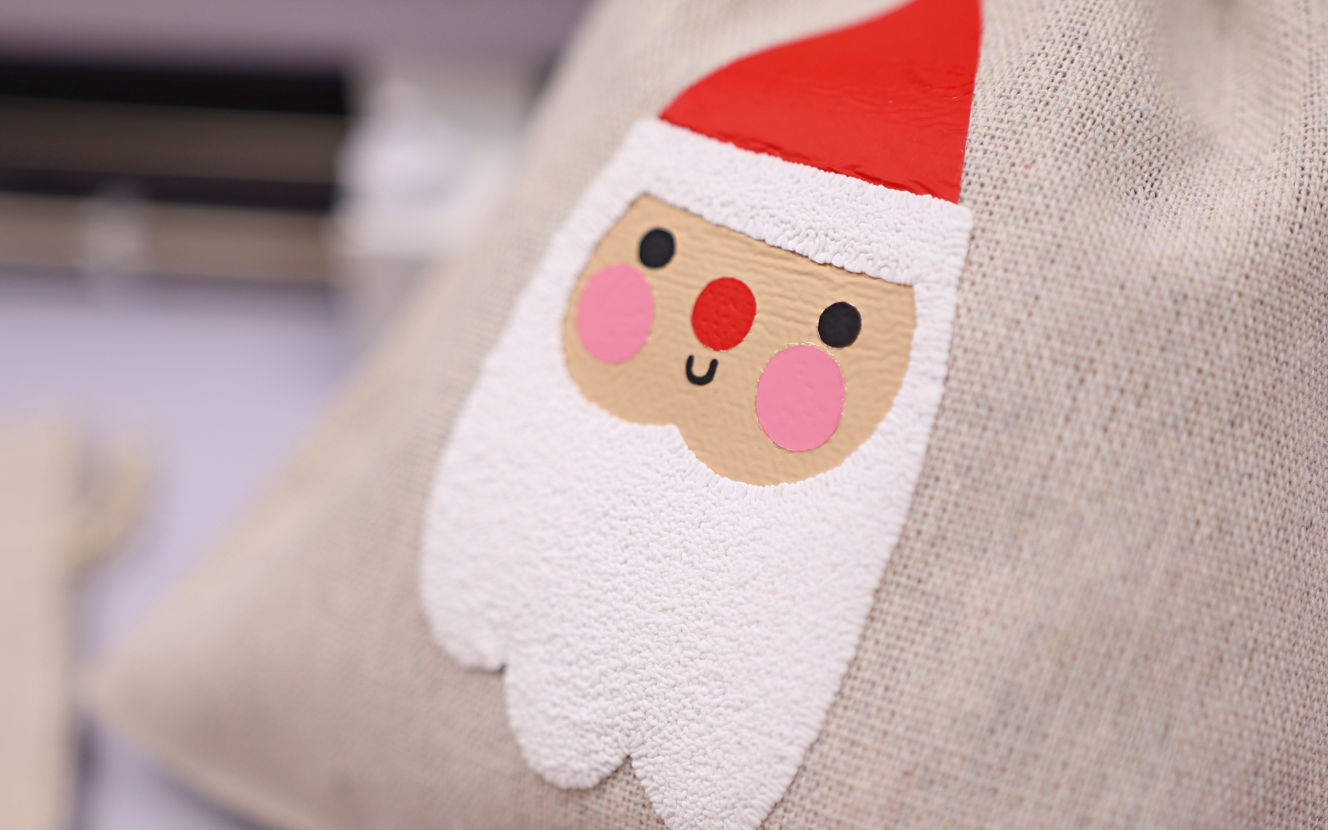 Ich habe drei Varianten: Santa-Gesicht, Kugel mit Zickzack-Muster und eine große Mütze. Ich lasse die Designs jeweils aus der passenden Folien schneiden und entgittere sie.