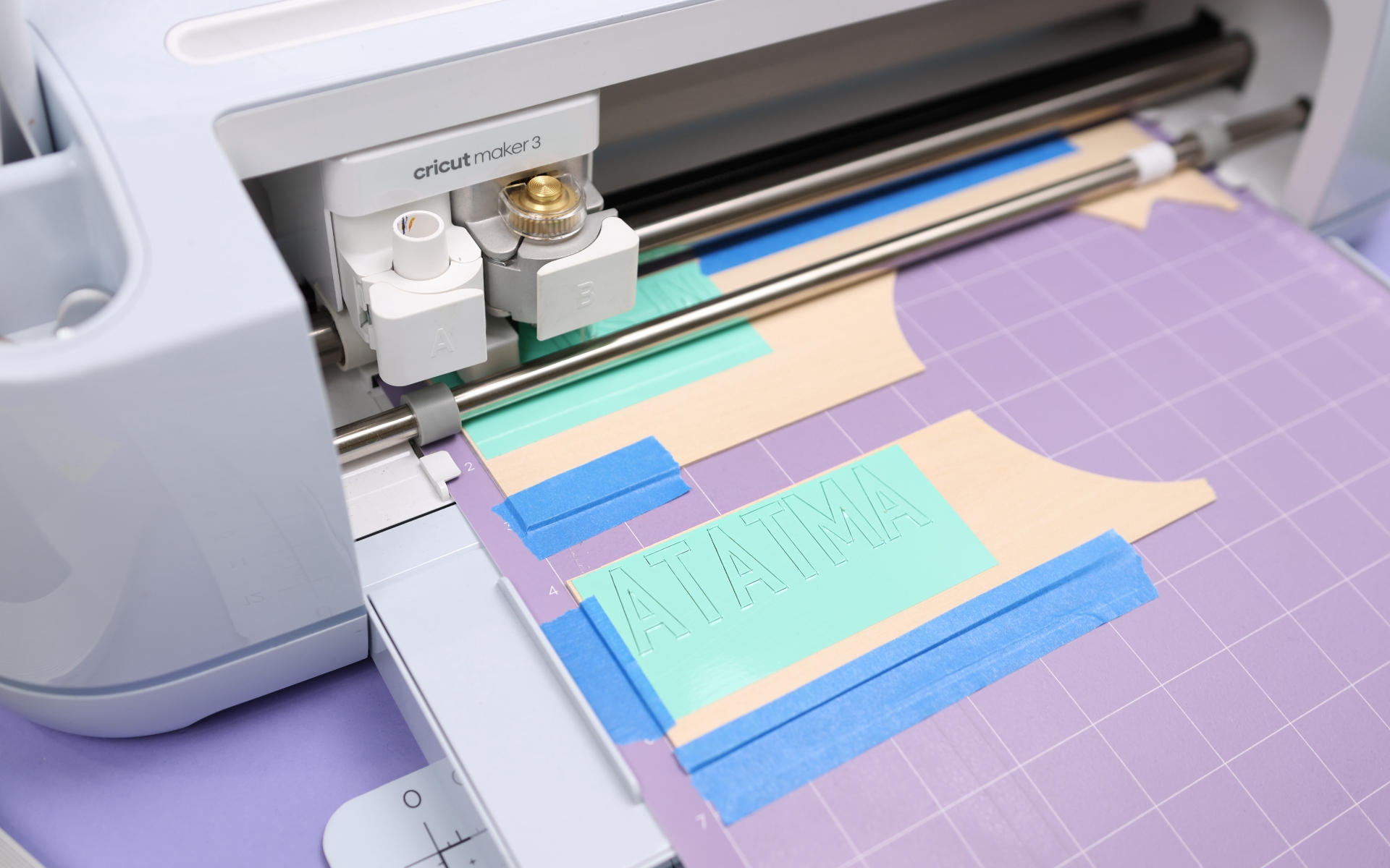 Zuerst lasse ich den großen Teil des Cake Toppers aus Lindenholz schneiden. Beim Holz immer das Cricut-Material nehmen – das funktioniert garantiert! Ich klebe das Holz auf die StrongGrip Matte und sichere es zusätzlich mit Kreppband, damit nichts verrutscht. Die weißen Rädchen vom Maker 3 schiebe ich an die Seite, damit sie keine Spuren auf dem Holz hinterlassen.