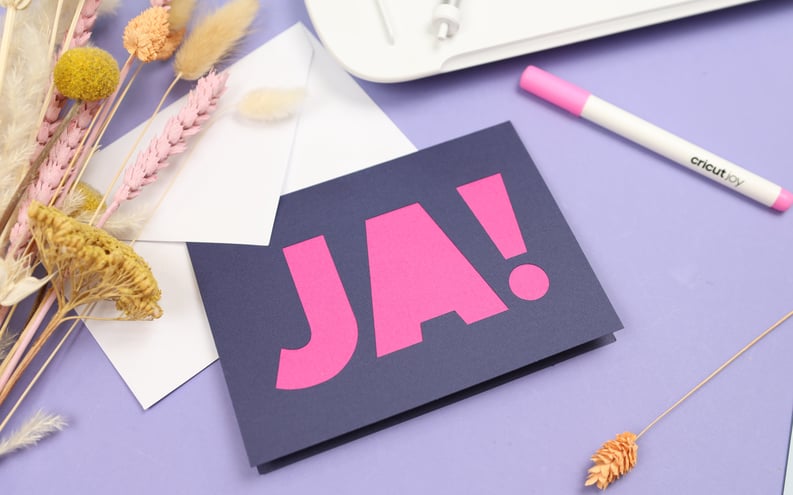 Ich habe zwei Schriftarten verwendet und damit ein großes „Ja“ für die Außenseite der Karte und die wichtigen Infos für die Innenseite gestaltet. Mit der Kartenmatte richtet sich alles schön mittig aus – super praktisch! Wählt in Design Space neben der Kartenmatte auch die richtige Kartengröße aus, dann schneidet der Joy Xtra das Design auch perfekt sitzend aus. Für die Innenseite habe ich einen Einlegebogen verwendet und den Text mit einem Gel Pen schreiben lassen. Die ausgeschnittenen Buchstaben könnt ihr für später aufbewahren oder z.B. auf den Umschlag kleben. Am Ende klebe ich den zweiten Einleger in die Karte, und fertig ist die Hochzeitseinladung!
