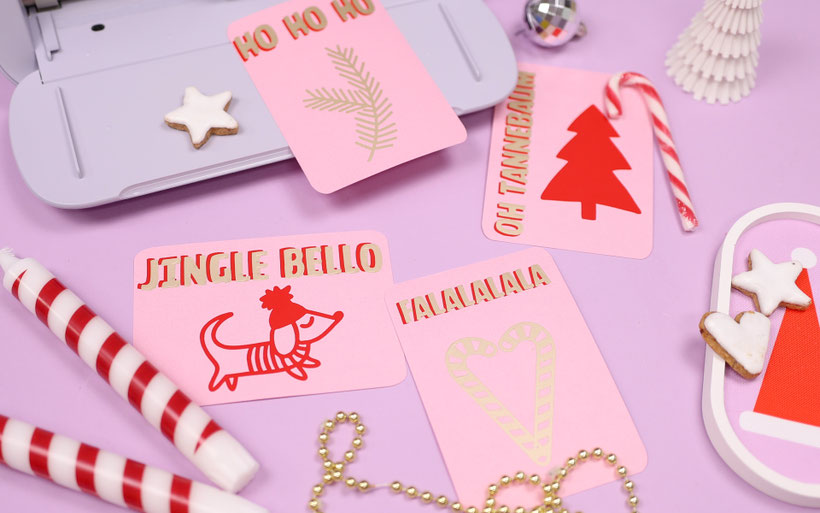 Statt Vinyl auf Papier (das gerne mal klebt oder sich verzieht) ist Iron-On auf Cardstock eine kleine Offenbarung. Ich habe ein Projekt erstellt, mit dem ihr vier schöne Weihnachtskarten gleichzeitig machen könnt.