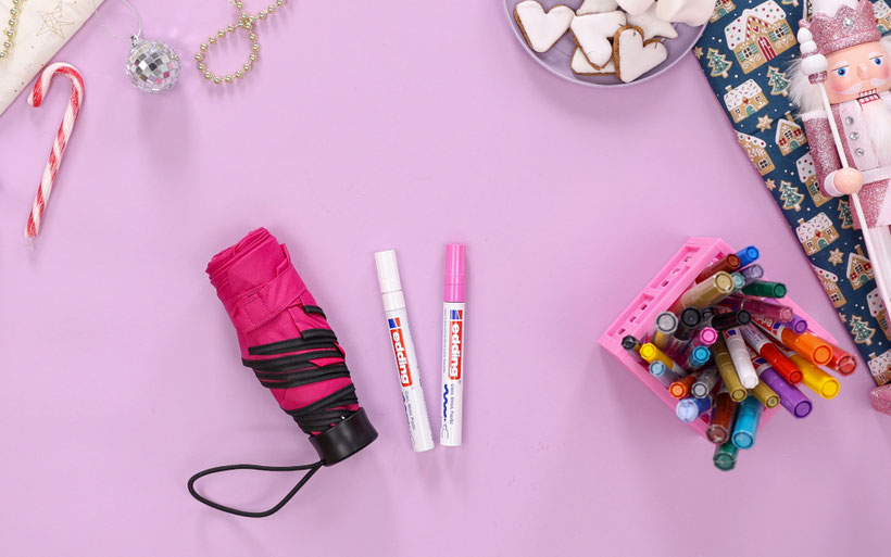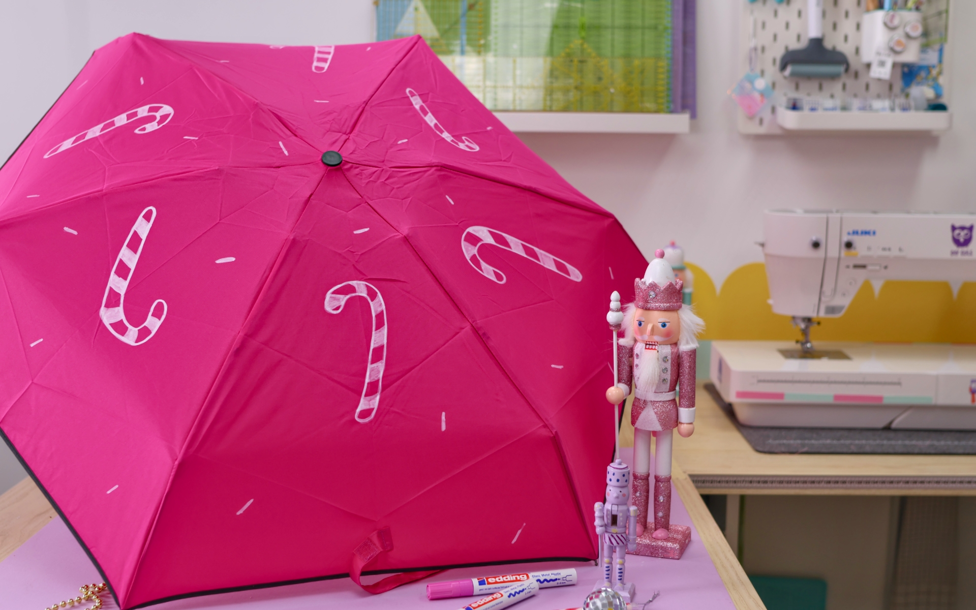 Ich habe eine einfache Zuckerstangen-Optik gemalt und den Griff im Candy-Cane-Look gestaltet. Der Schirm ist ein echter Stimmungsaufheller für graue Tage – und perfekt für Weihnachtsmarkt-Ausflüge.