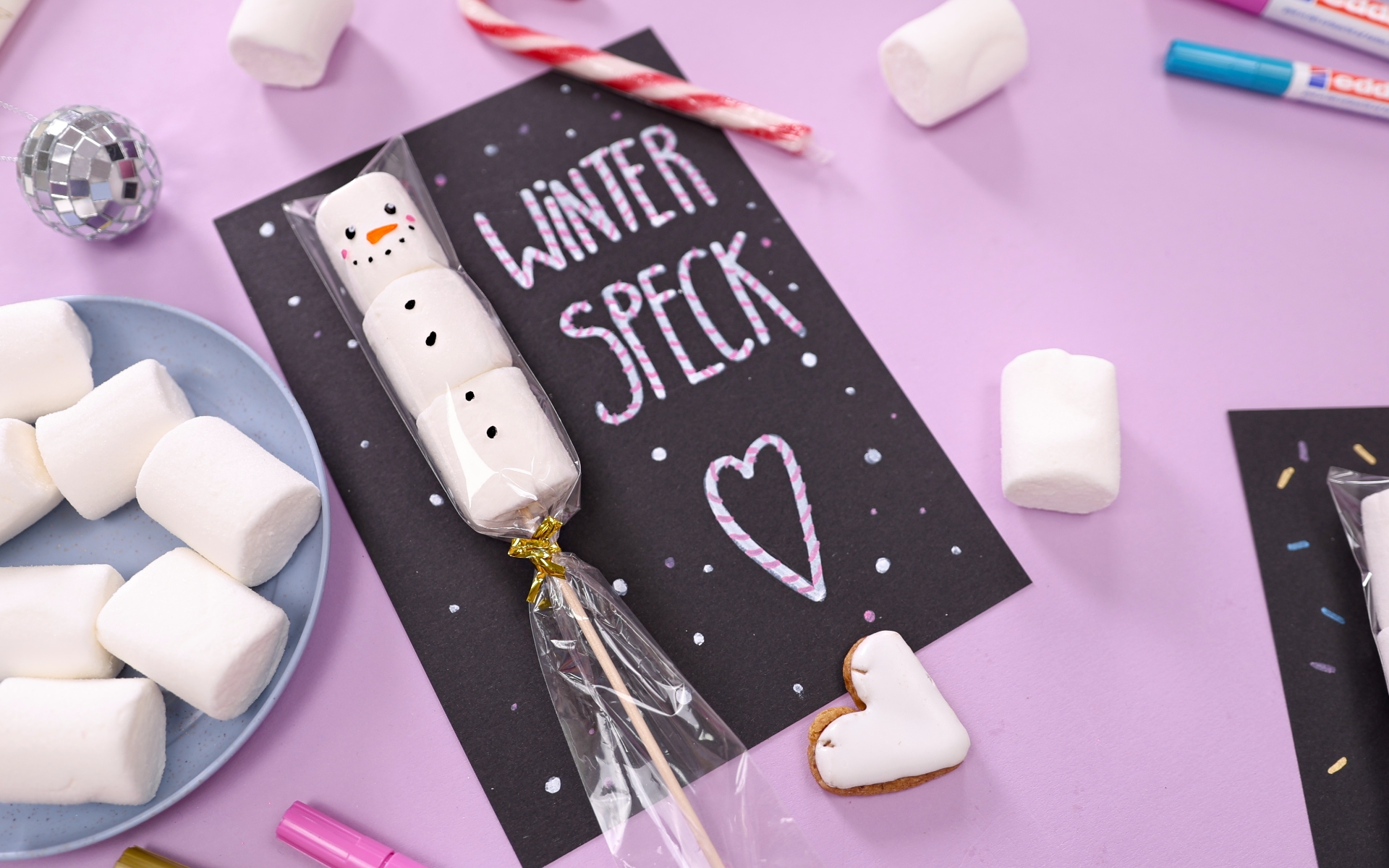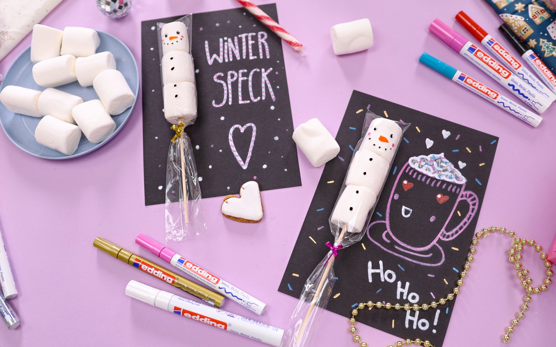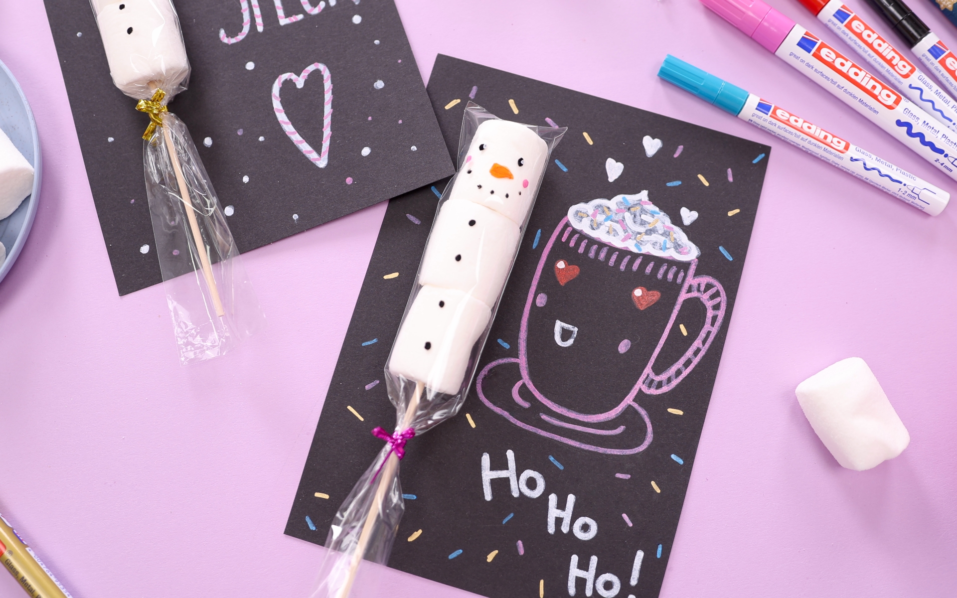 Süß, witzig und perfekt als kleines Geschenk: Diese Weihnachtskarte mit Marshmallow-Schneemann ist ein echter Publikumsliebling! Ich habe kleine Schneemänner aus Marshmallows gebastelt und sie in Tütchen verpackt. Dazu gibt’s eine selbst gestaltete Karte – auf dunklem Fotokarton wirken die Glanzlackmarker nämlich besonders schön, weil sie richtig kräftig leuchten.