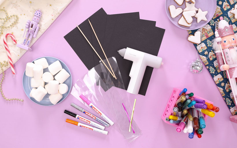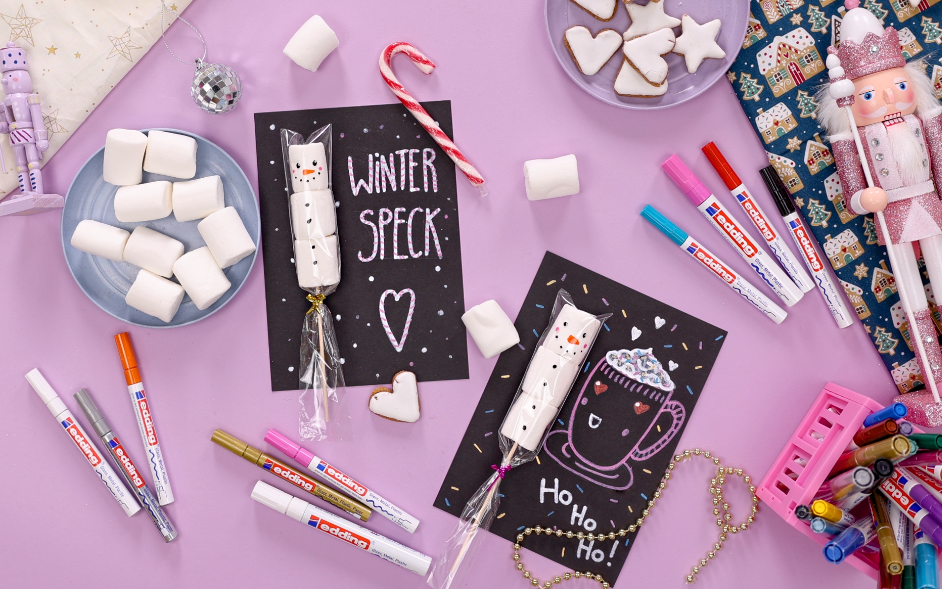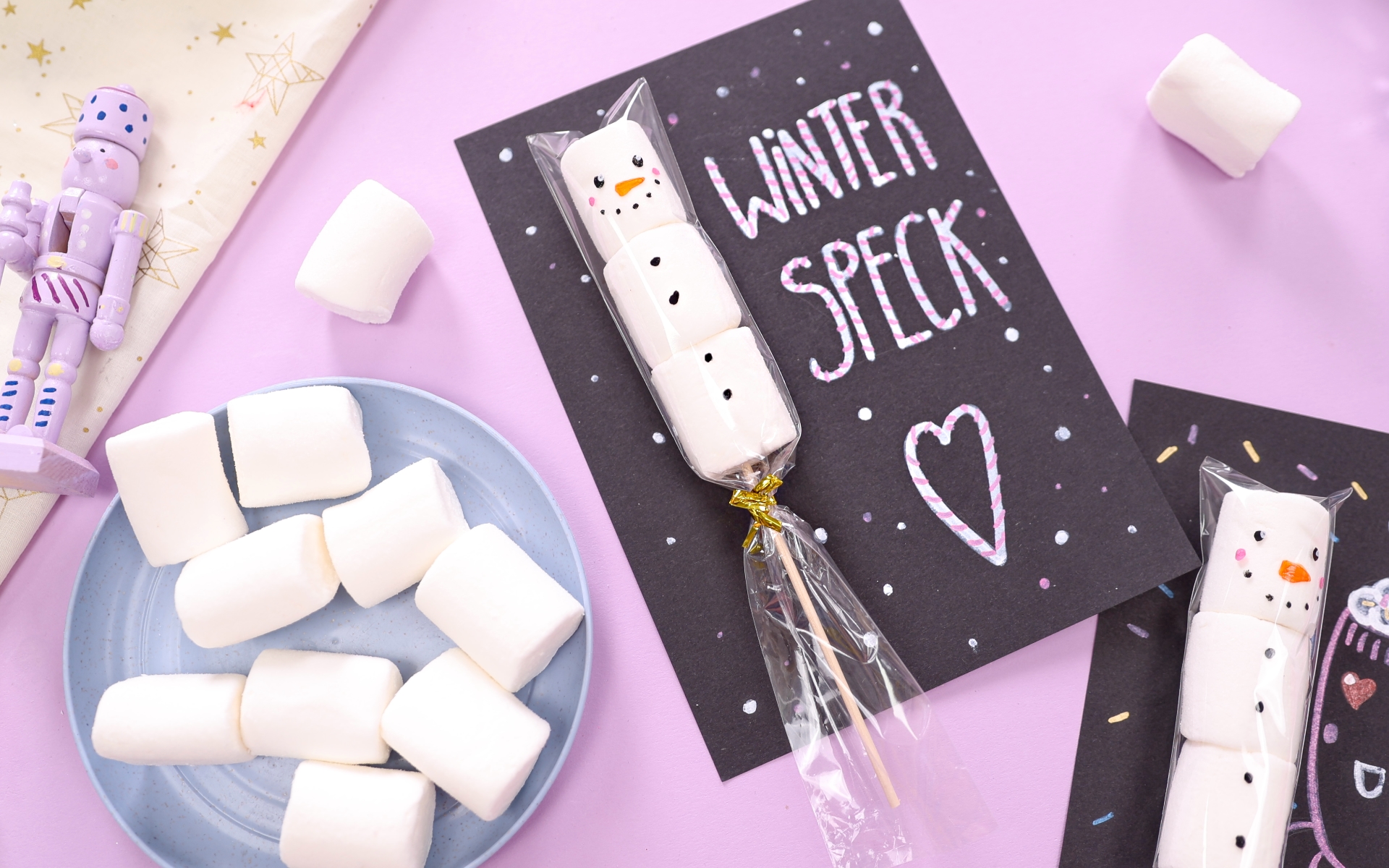 Süß, witzig und perfekt als kleines Geschenk: Diese Weihnachtskarte mit Marshmallow-Schneemann ist ein echter Publikumsliebling! Ich habe kleine Schneemänner aus Marshmallows gebastelt und sie in Tütchen verpackt. Dazu gibt’s eine selbst gestaltete Karte – auf dunklem Fotokarton wirken die Glanzlackmarker nämlich besonders schön, weil sie richtig kräftig leuchten.
