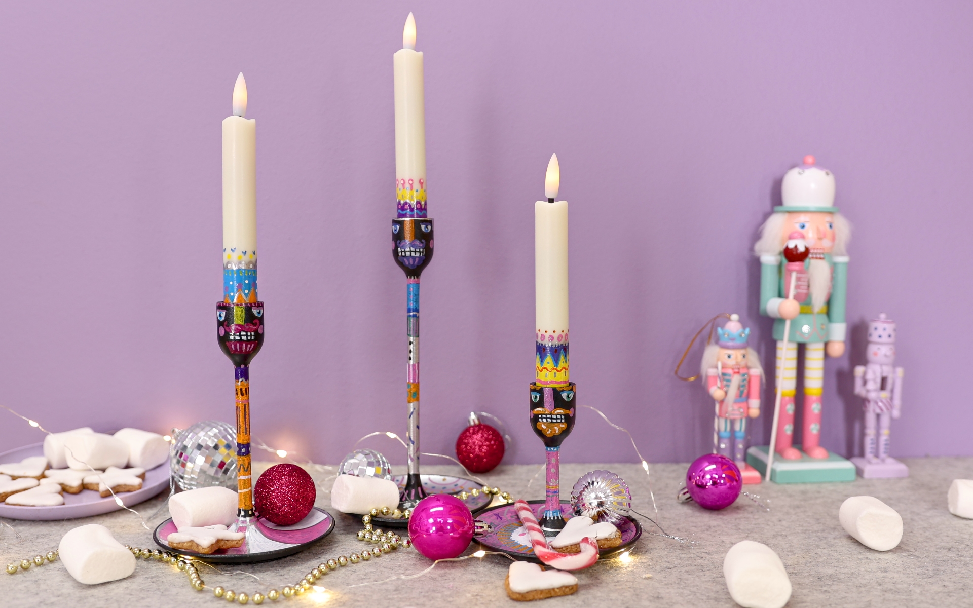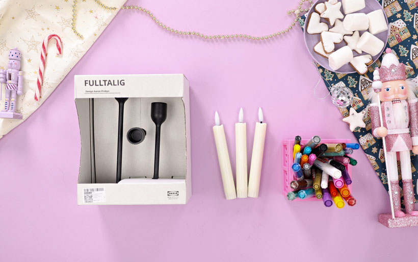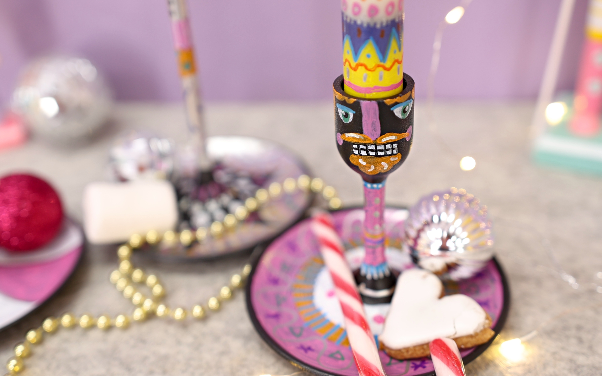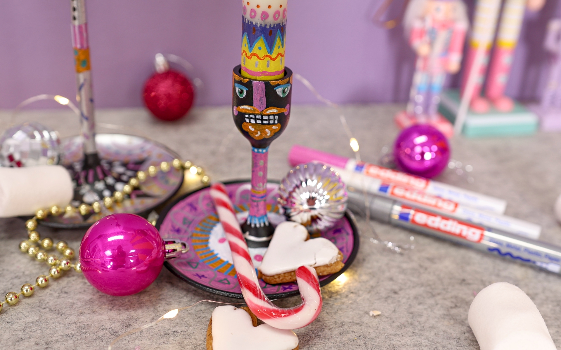 Zum Abschluss wird’s nochmal richtig festlich: Ich habe aus schlichten Metall-Kerzenständern kleine Nussknacker gemalt. Mit den Glanzlackmarkern könnt ihr wunderbar Schichten übereinander malen – so entstehen Gesichter, Uniformen und kleine Details, die aussehen, als wären sie gedruckt. Ich liebe das Ergebnis – bunt, verspielt und total besonders!