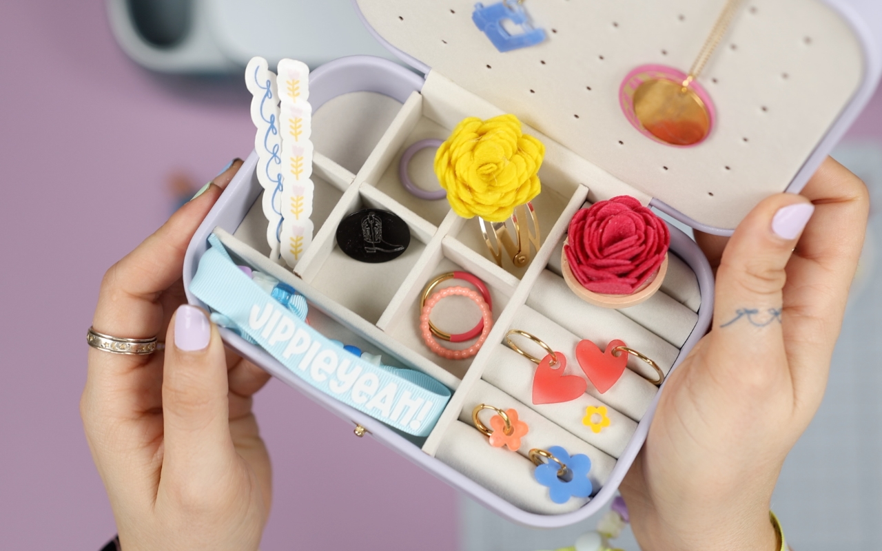 Schmuck selber machen mit Cricut? Ich zeige dir heute 6 kreative DIY Schmuck Ideen, die nicht nur modern und bunt sind, sondern auch ganz unterschiedliche Materialien und Techniken kombinieren. Von Ohrringen aus Schrumpffolie, über gravierte Ketten, Tattoo-Ringe bis hin zu Armbändern und einer passenden Schmuckschatulle ist alles dabei. Perfekt, wenn du Lust auf individuellen DIY Schmuck hast, der garantiert nicht nach Bastelkiste aussieht.