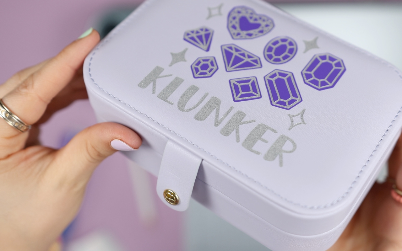 Zum Abschluss bekommt die selbstgemachte Schmuckkollektion noch ein Zuhause. Mit Vinylfolie lässt sich eine schlichte Schmuckschatulle ganz schnell individualisieren und an den restlichen Schmuck anpassen.