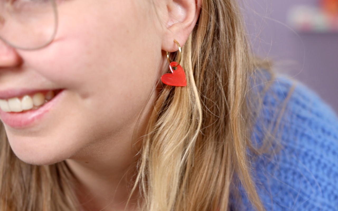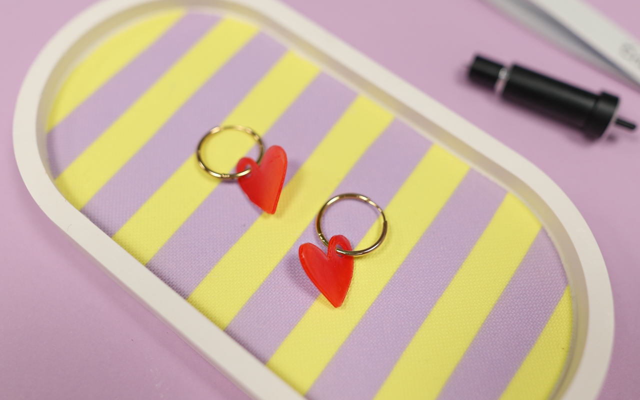 Ich gestalte die Motive bewusst doppelt so groß, wie sie später sein sollen. Geschnitten wird mit der Tiefschnittklinge und einer Materialeinstellung wie Magnet 1 mm. Nach dem Schneiden schrumpfe ich die Teile mit Hitze und befestige sie anschließend an Creolen.
