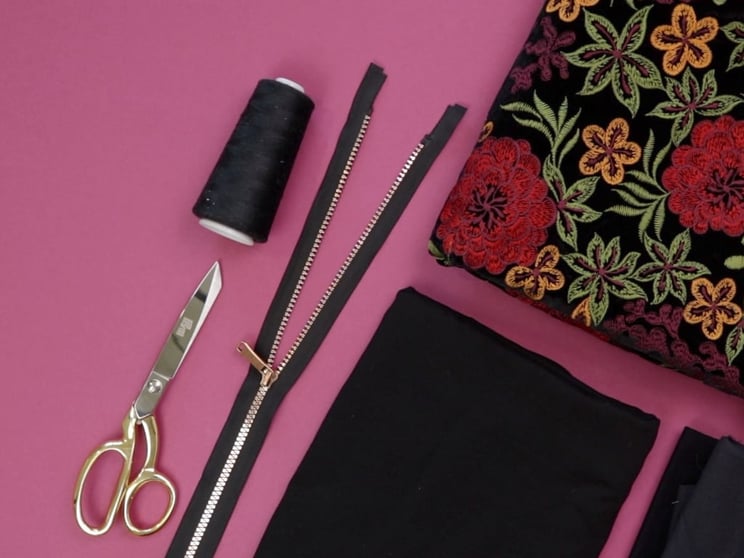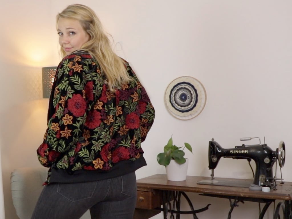 Der bestickte Samt ist unglaublich schön und hochwertig. Zunächst hatte ich gedacht, dass sich das Material relativ kompliziert verarbeiten lässt, da es an Stellen mit Stickerei relativ dick ist und an Stellen ohne Stickerei elastisch ist. Mit dem Material hatte ich jedoch kaum Probleme. Ich habe die Jacke mit einer Kombination aus Overlock und Haushaltsnähmaschine genäht – Ihr könnt sie aber auch komplett an der Haushaltsnähmaschine nähen.