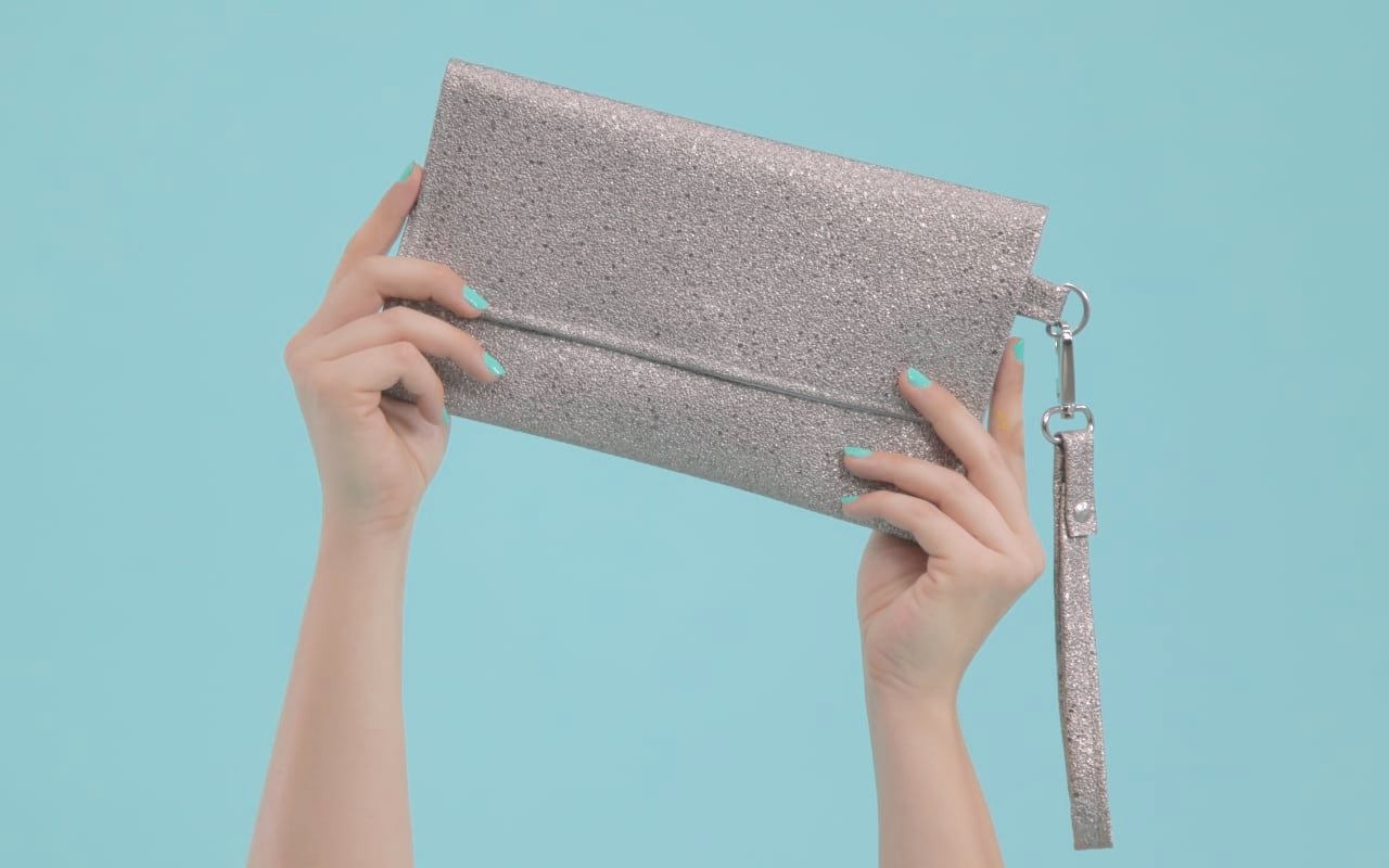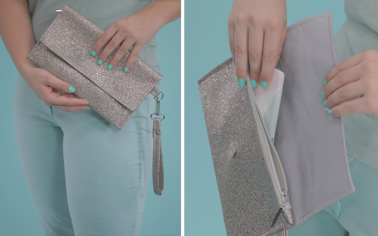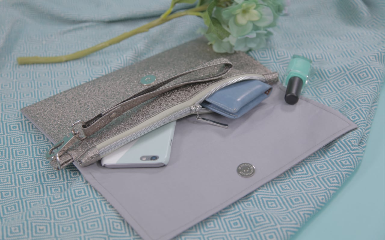 #ClutchClara ist aus einem schicken, funkelndem Kunstleder genäh: das silberne Kunstleder „Rocks“ . Die Clutch hat neben dem Hauptfach auch ein Reißverschlussfach – sehr praktisch! Die Klappe wird mit einem Magnetverschluss geschlossen und an der schicken Lasche könnt ihr sie locker am Handgelenk tragen. Einfach genäht und perfekt für jede Party.