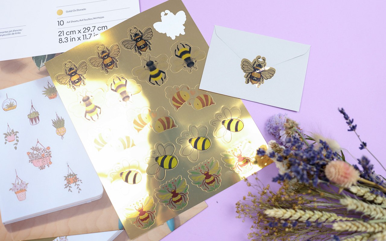Bedruckbare Vinylfolie ist wesentlich flexibler als das Sticker Paper. Ich habe hier Vinyl in gold und Silber verwendet. Ich war erstaunt, wie gut die Farben auch auf den metallischen Papieren herauskommen.