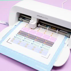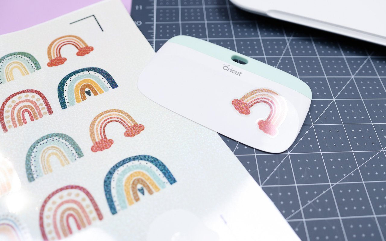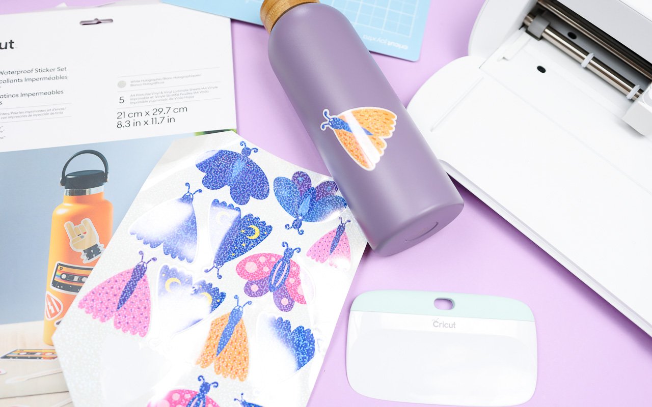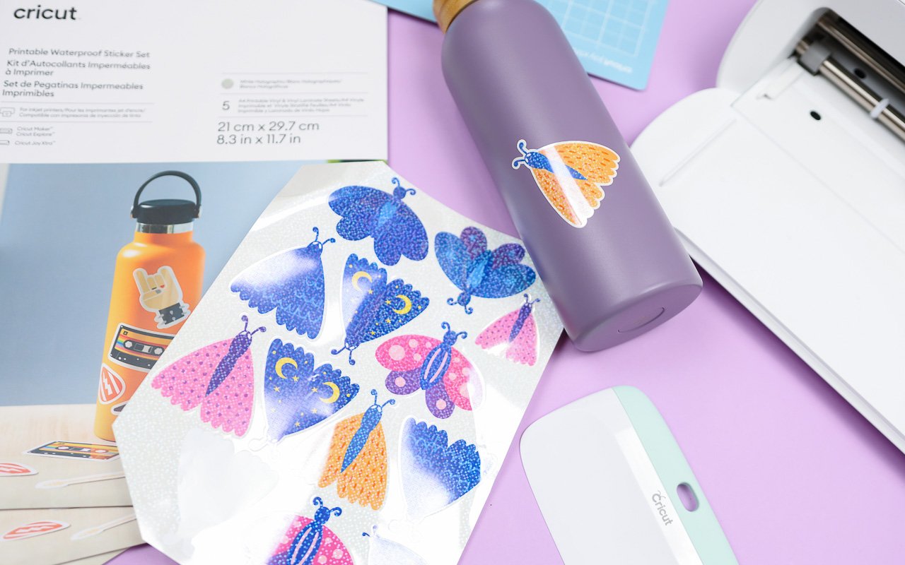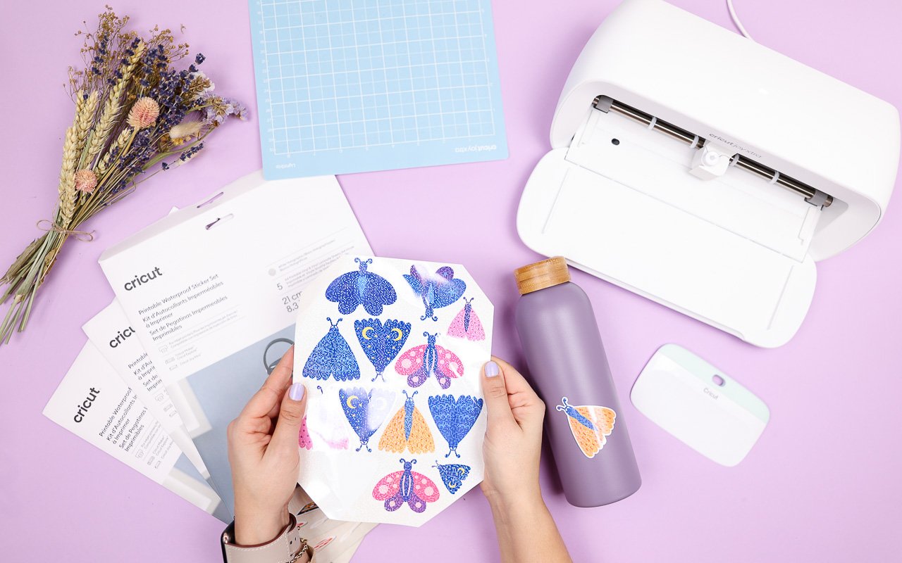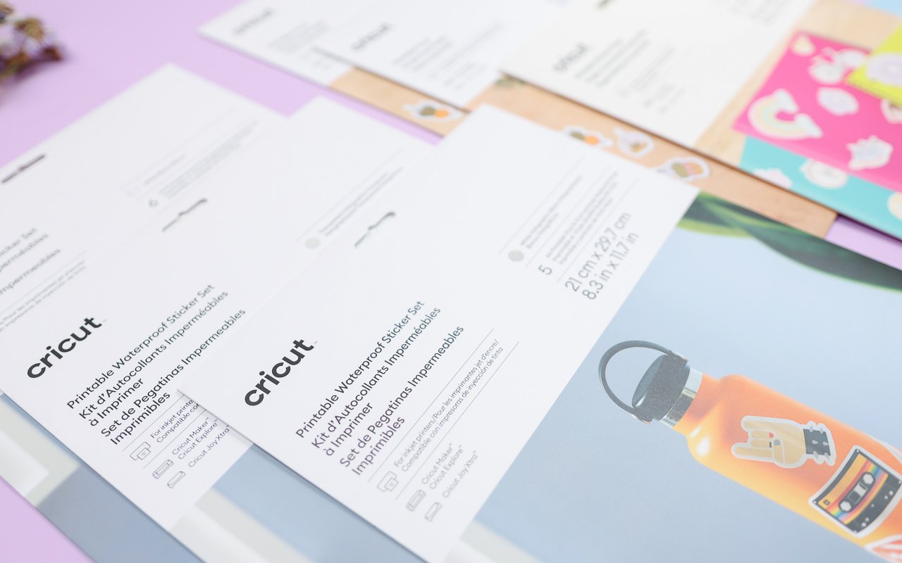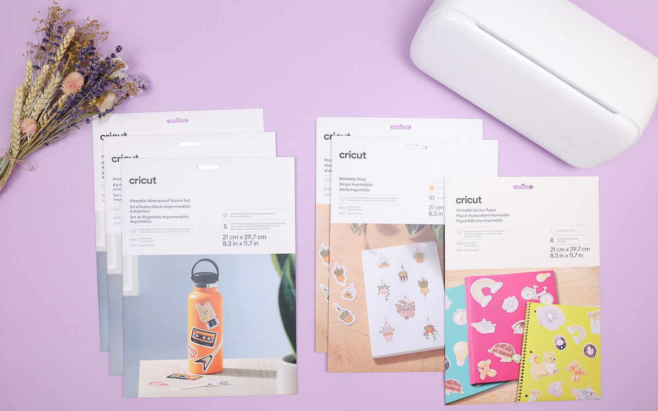 Die neuen bedruckbaren und wasserfeste Sticker Sets sind der absolute Knaller. Es gibt sie in verschiedensten Versionen mit weißem oder transparentem Hintergrund und auch mit Holofolie als Finish. Dabei wird das Motiv erst auf die Stickergrundlage gedruckt. Anschließend wird die obere, wasserfeste Schicht darauf geklebt. Danach schneidet der Cricut Joy Xtra die Sticker aus.