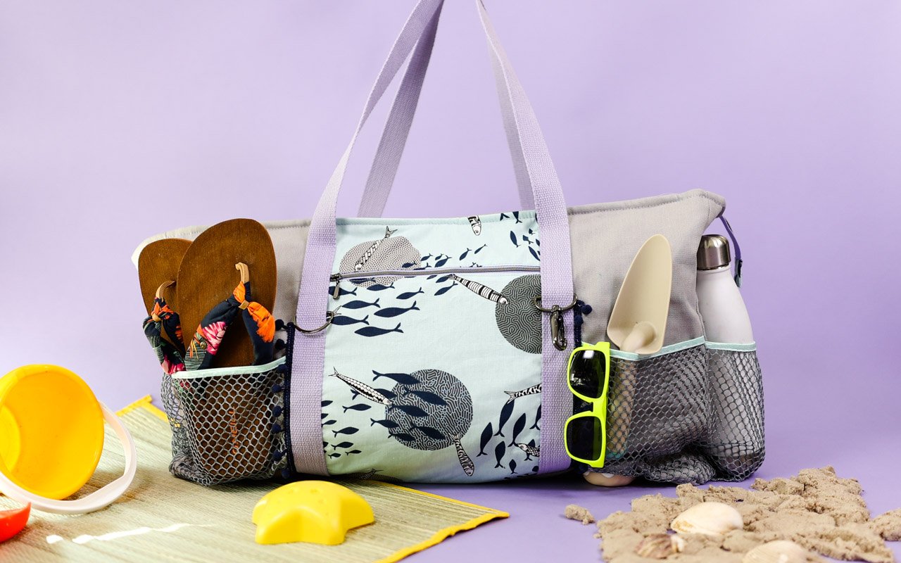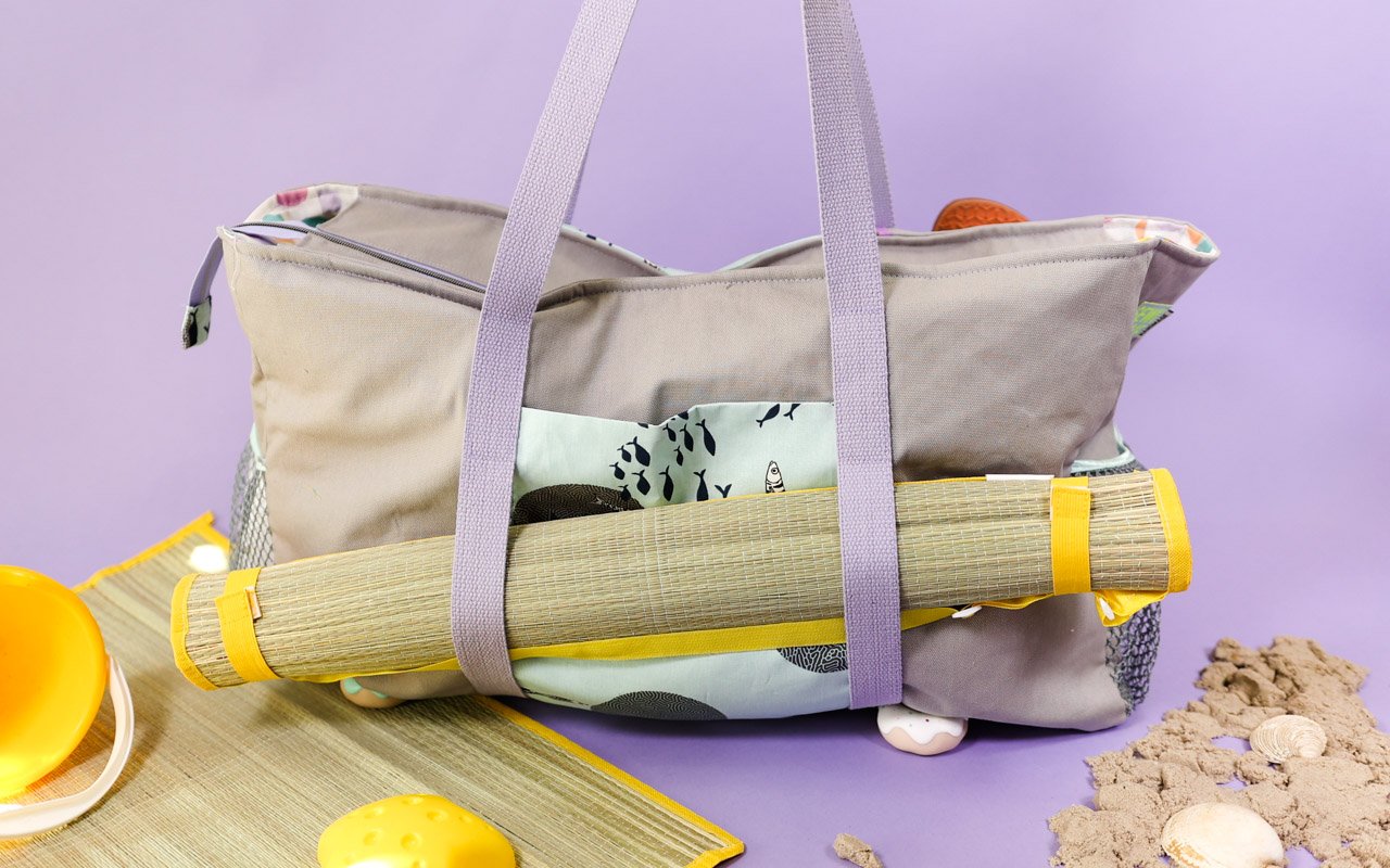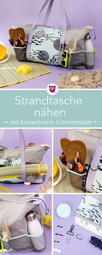 Die Strandtasche hat einen großen Hauptreißverschluss, Gurtbandhenkel und viele Taschen. Vorn gibt es eine Reißverschlusstasche und hinten ein Einsteckfach. Am hinteren Gurtband kann außerdem eine Strandmatte befestigt werden. Die Meshfächer vorn und an der Seite sind super für sandige Accessoires und Getränke. Am Vorderen Gurtband habe ich außerdem einen D-Ring und einen Karabiner angebracht um daran weitere Kleinigkeiten (z.B. Cappy) befestigen zu können. Als Futter habe ich hier eine beschichtete Baumwollwebware verwendet – perfekt für die feuchten Strandsachen. Dazu gibt es ein großes Nassfach, wo besonders nasse Sachen oder eben auch die Sachen, die trocken bleiben sollen, verstaut werden können.