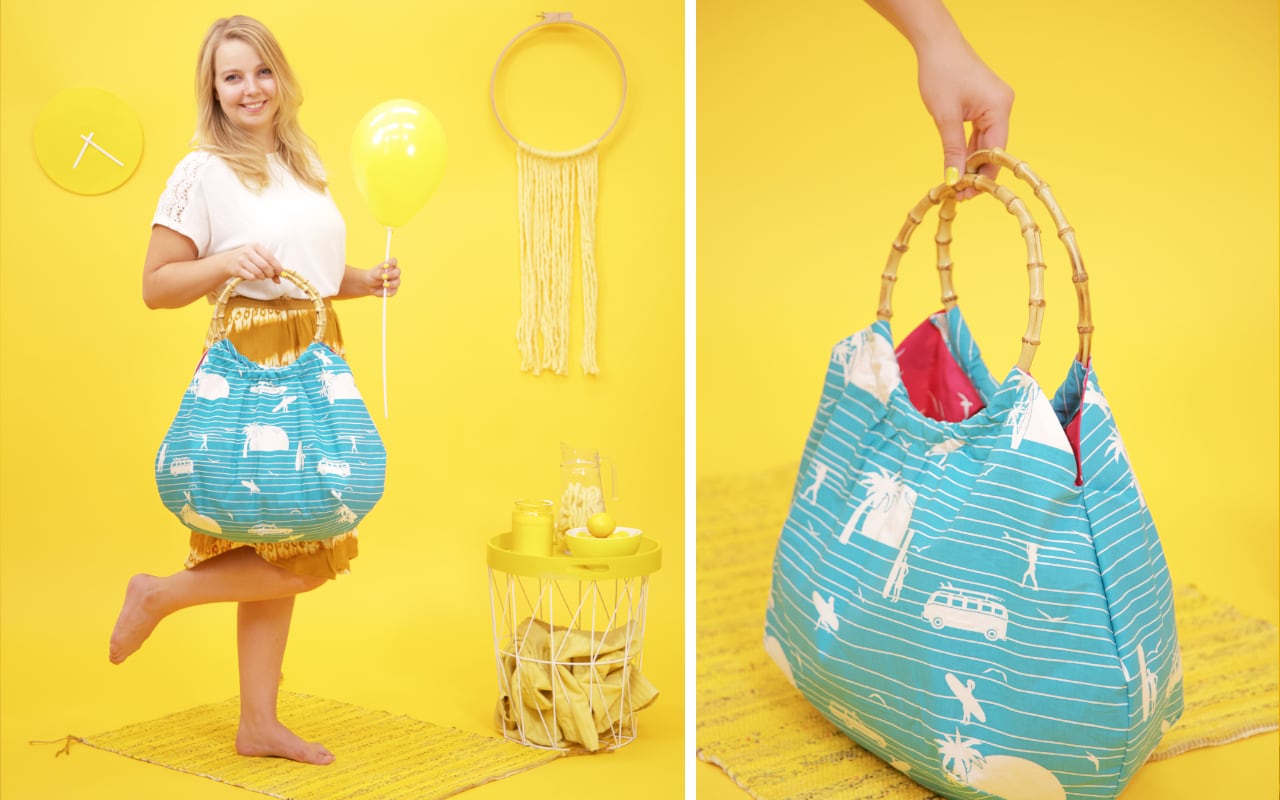#HenkeltascheHailey ist sehr schnell genäht und eignet sich auch gut für Anfänger. Die Bambushenkel und die farbenfrohen Stoffe machen die Tasche perfekt für den Sommer-Look am Strand. Der Clou ist, die Tasche kann man wenden und so mal die eine und mal die andere Seite außen tragen.