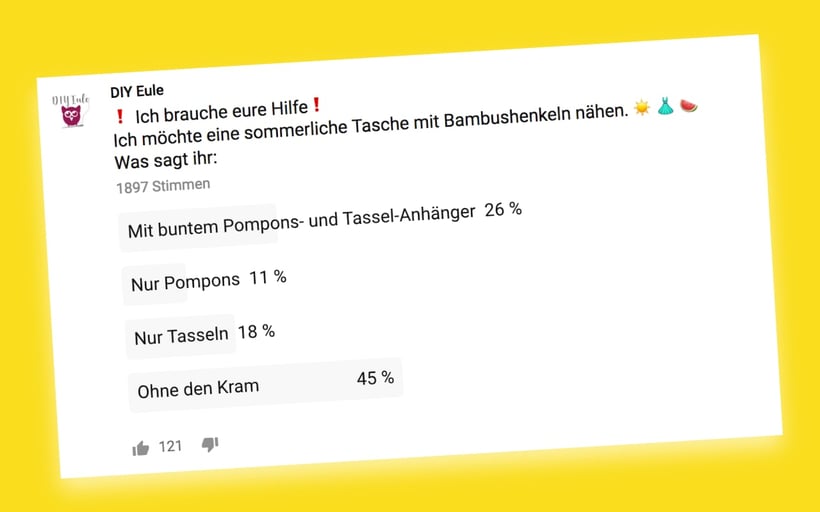 Das #DIYEuleBuch habe ich zusammen mit euch, der Community geschrieben. Zu allen Taschen wurden Entscheidungen, z.B. zur Stoffauswahl, Verschlussart oder auch Form auf YouTube, Instagram und Facebook durch die Näh-Fans getroffen. Jede Tasche hat außerdem einen eigenen Namen und einen passenden Hashtag – so können alle ihre Tasche der Community zeigen und sich dort auch inspirieren lassen.