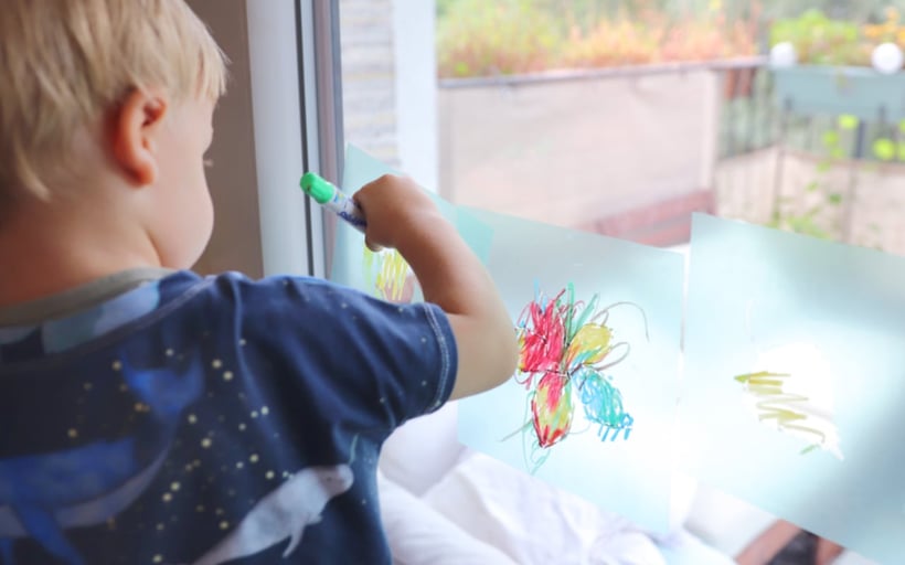 Die Folie wird dann einfach ans Fenster geklebt und die Kleinen können ausmalen. Das macht total Spaß und geht eben auch schon für ganz kleine Künstler. Lasst euer Kind erst ein paar Minuten warm werden mit der Technik - dann ist es ein Selbstläufer.