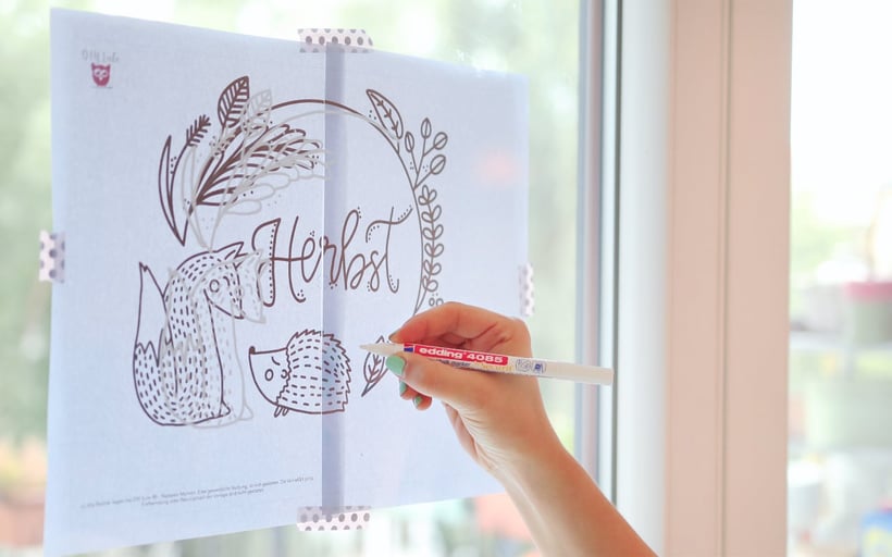 Heute ist Herbstanfang und passend dazu habe ich eines unserer Fenster herbstlich dekoriert mit meinen edding Kreidemarkern. Die hab euch ja bereits einige Male vorgestellt und auch heute habe ich wieder eine kostenlose Druckvorlage für euch, damit ihr direkt loslegen könnt. Außerdem habe ich heute auch das erste Mal die FUNTASTICS Window Fun Stifte von edding zusammen mit dem #DIYeulchen ausprobiert und mit Schablonen eine bunte Blätterkette ans Fenster gezaubert.