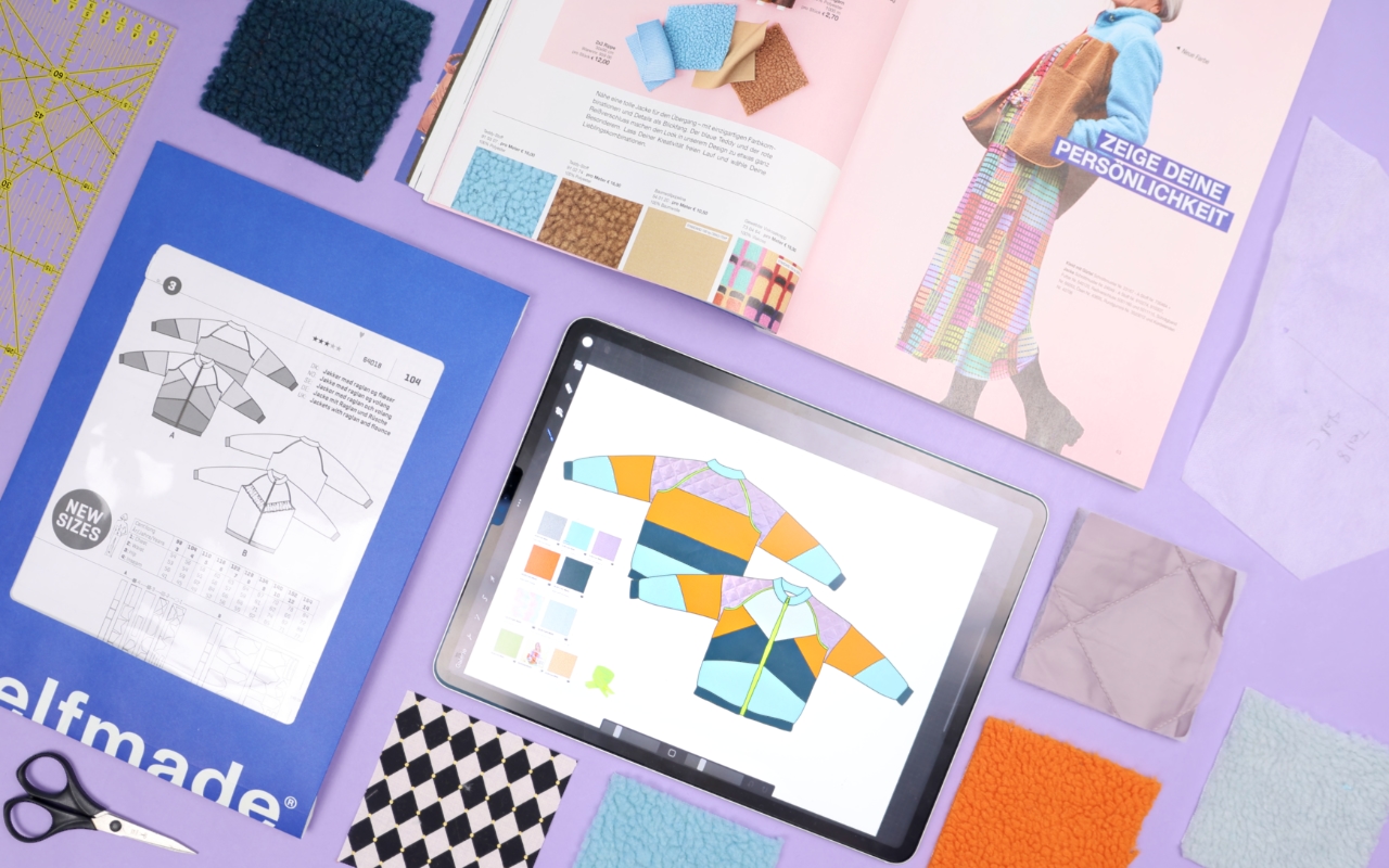 Ich arbeite dann immer gern mit Visualisierungen. Also habe ich mir mein Tablet geschnappt und mit einem Screenshot der Schnittzeichnung verschiedene Farbkombinationen ausprobiert. Das geht aber natürlich auch ganz klassisch mit Papier und Stift.