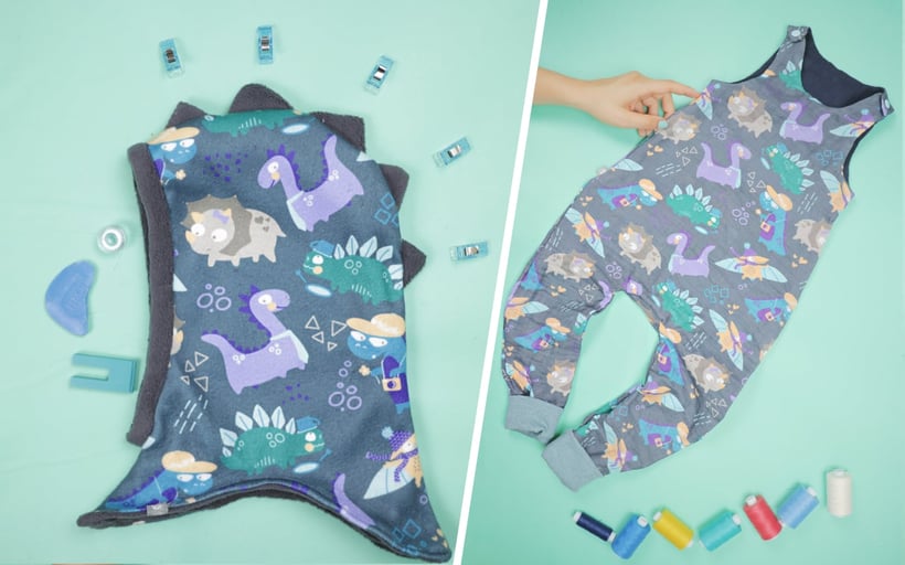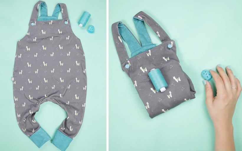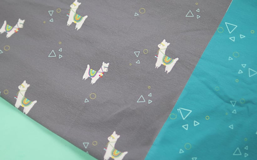 Beim #GeoLama Stoff habe ich zwei Elemente miteinander verbunden, die ich Liebe: Lamas und geometrische Elemente. Der Stoff hat auf der linken Seite lustige, bunte Lamas auf einem grauen Grund und auf der rechten Seite einen passenden Musterstoff in Petrol mit Dreiecken und Kreisen. So könnt ihr mit einem Stoff perfekte Kombinationen schaffen und ihn wie einen Panel vernähen. Ich habe daraus eine Latzhose genäht.