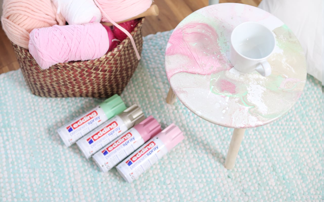 Die edding Permanent Sprays sind für mich absolute Must-haves für DIY-Verrückte. Ich habe schon so viel mit den Sprays gemacht... Vasen und Körbe verziert, Elemente auf dem Metallregal auf meinem Balkon, die komplette Deko vom #DIYeuleBuch und sogar mein Fahrrad habe ich damit lackiert. Heute zeige ich euch mal eine ganz andere Technik, die ich vor Jahren schon einmal ausprobiert habe: Marmorieren mit Spray bzw. Faux Marble. Ich werde einen kleinen, preiswerten Holztisch aufpimpen und in einem coolen Marmor-Look erstrahlen lassen.