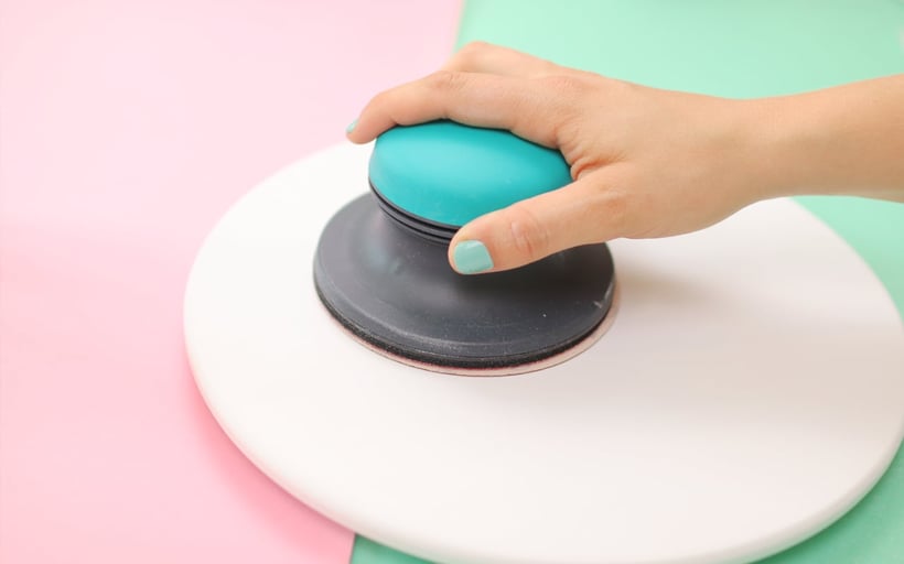 Zugegeben, oft nutze ich einfach nur den Farblack plus Klarlack – und das hat bis jetzt auch bei den einfacheren Projekten gut gehalten. Aber heute mache ich es nach dem Lehrbuch. Zuerst schleife ich den Tisch etwas an. Dazu habe ich mir extra einen kleinen Handschleifer (AL) besorgt.
