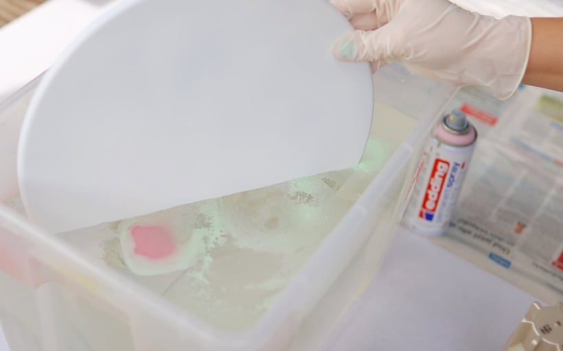 Ich habe mir dann eine alte Plastikbox geschnappt und diese mit Wasser gefüllt. Der Behälter muss auf jeden Fall tief genug sein, dass ihr euren Gegenstand gleich etwas tauchen könnt. Nachdem ich die vier Trendfarben vorbereitet habe (schütteln und Ring entfernen), sprühe ich kleine Kleckse auf die Wasseroberfläche. Das Marmormuster bildet sich eigentlich fast von alleine. Anschließend wird die Tischplatte durch das Wasser getaucht. Zieht dafür am besten Gummihandschuhe an und legt Eheringe und co. vorher ab. Ich habe das insgesamt drei Mal gemacht, damit der Tisch überall ein Muster erhält. Beim Tauchen drehe ich die Tischplatte leicht. Wichtig ist, das ihr die Platte nicht hochhebt, so lange sie noch nicht komplett eingetaucht war und so lange sie noch mit Teilen der auf der Wasseroberfläche schwimmenden Lackschicht verbunden ist. Das Ganze muss dann wieder etwas trocknen.