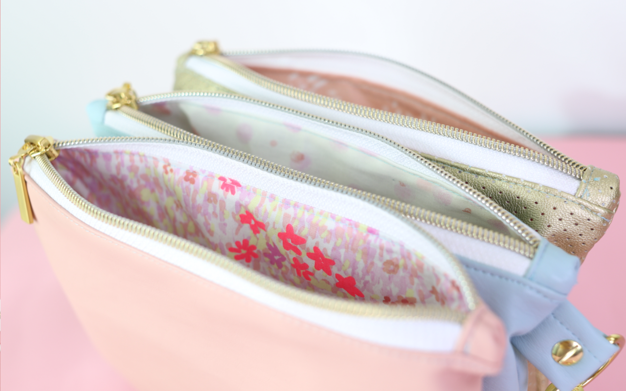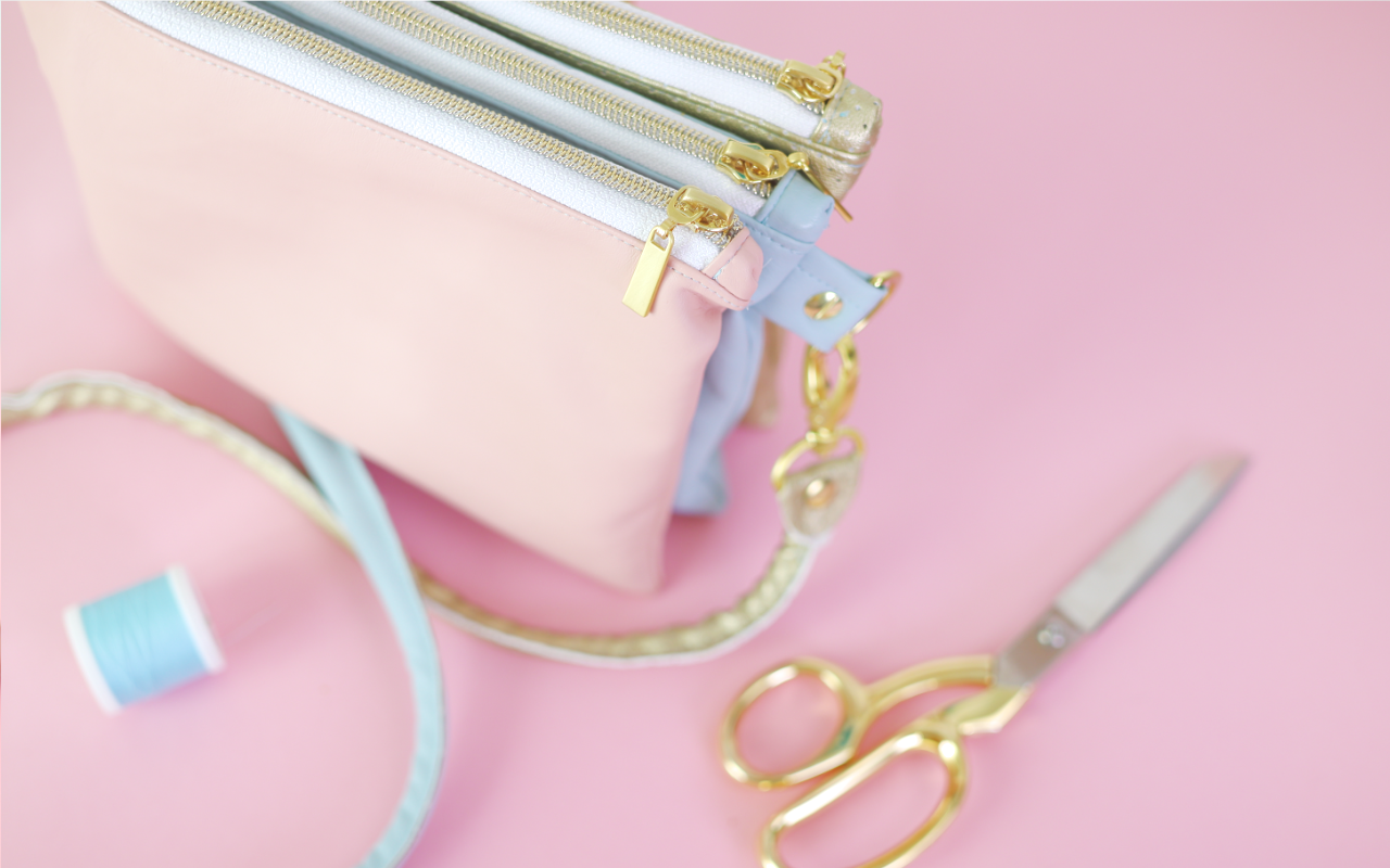 Meine Tasche habe ich aus drei sehr weichen, farbigen Kunstlederstoffen in rosa, hellblau und gold genäht. Das Gold kommt auch noch einmal ind en Taschen-Accessoires vor. Ich finde die Kombination wirklich schön und freue mich schon, eure Zusammenstellungen zu sehen!