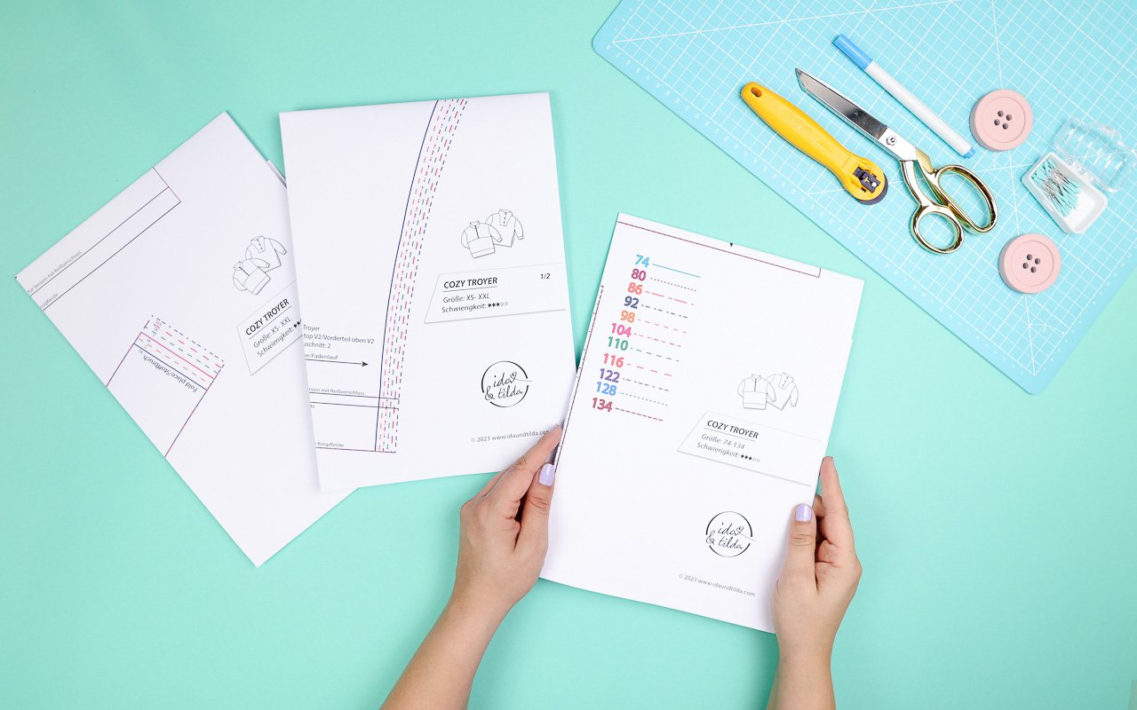 Ihr könnt den Schnitt bei Ida & Tilda entweder als Papierschnitt oder als E-Book erwerben. Beide Varianten sind mit einer ausführlichen Anleitung versehen. Digital erhaltet ihr eine A4-Datei zum Zuhauseausdrucken und eine A0-Datei, die ihr im Copyshop oder online drucken lassen könnt. Ich persönlich drucke super gerne im Copyshop und schneide dann direkt aus dem großen Bogen zu.