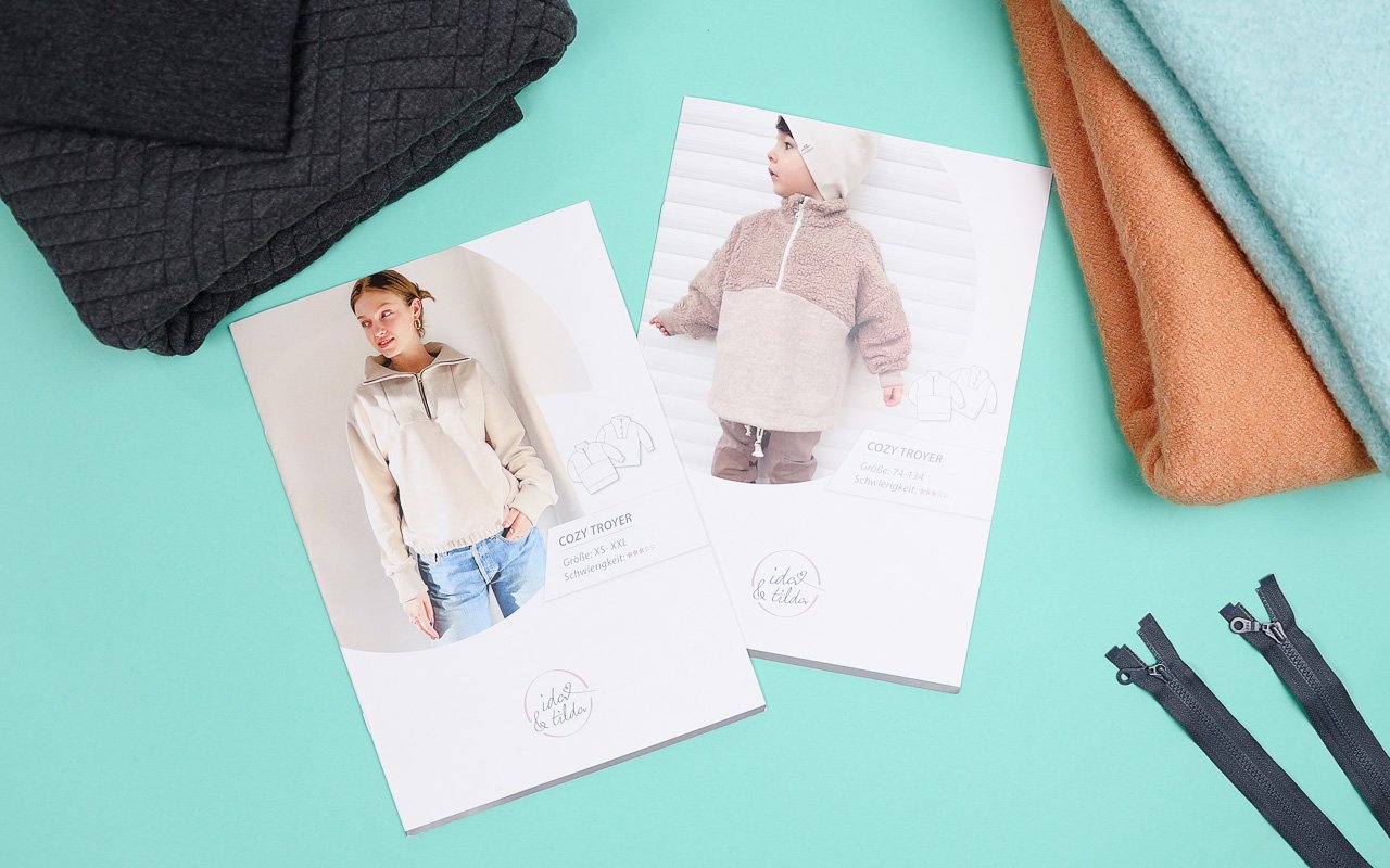 Das Schnittmuster ist der Cozy Troyer von Ida & Tilda, den es sowohl für Kinder als auch für Erwachsene gibt. Der Troyer ist oversized geschnitten, was ihm diesen lässigen, gemütlichen Look verleiht. Und liebe Männer: Mit ein paar kleinen Anpassungen lässt sich dieser Schnitt auch für euch realisieren.