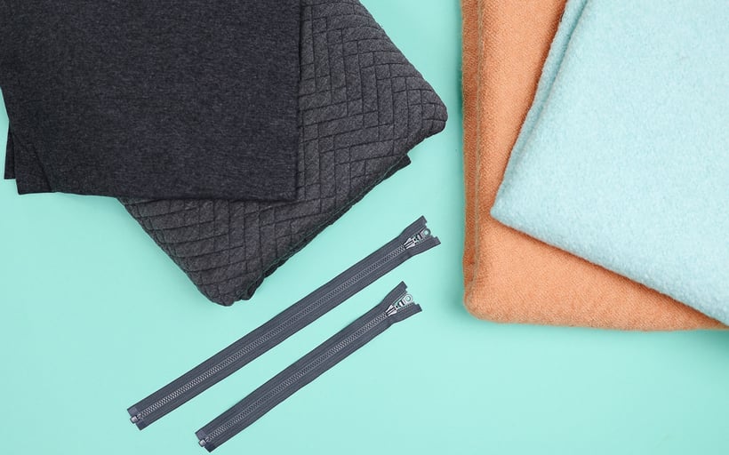 Als Stoff habe ich mich für einen dicken, leicht elastischen Mantelboucle mit 30% Wollanteil in den Farben Koralle und Mint entschieden. Außerdem habe ich einen Stepp-Jersey mit Fischgrat Muster und hohem Viskoseanteil verwendet.