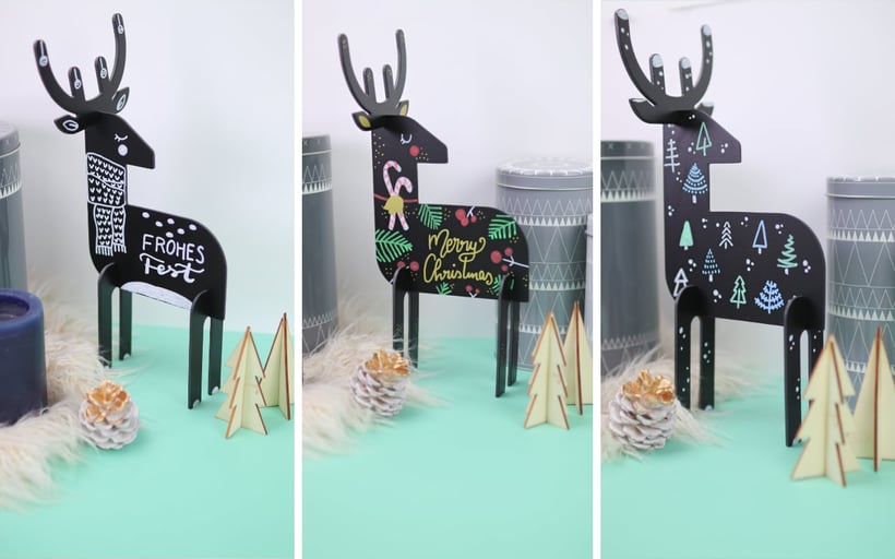 Für die erste Variante habe ich mir ganz klassisch nur einen weißen Kreidemarker geschnappt. Da kann man nichts falsch machen – gerade auf schwarzen Tafeln sieht das immer gut aus! Ich habe hier die Form des Rehs als solche genommen und dem Reh ein Gesicht verliehen. Geschlossene Augen und ein Kreis für die Wangen machen schnell ein niedliches Gesicht – mehr braucht es gar nicht. Das Reh hat noch einen dicken Wollschal bekommen, ein paar Flecken auf dem Rücken, einen Bauch, Hufe, Ohren... Anschließend habe ich noch ein "Frohes Fest" auf den Körper gelettert – das ist aber natürlich optional. Fertig!